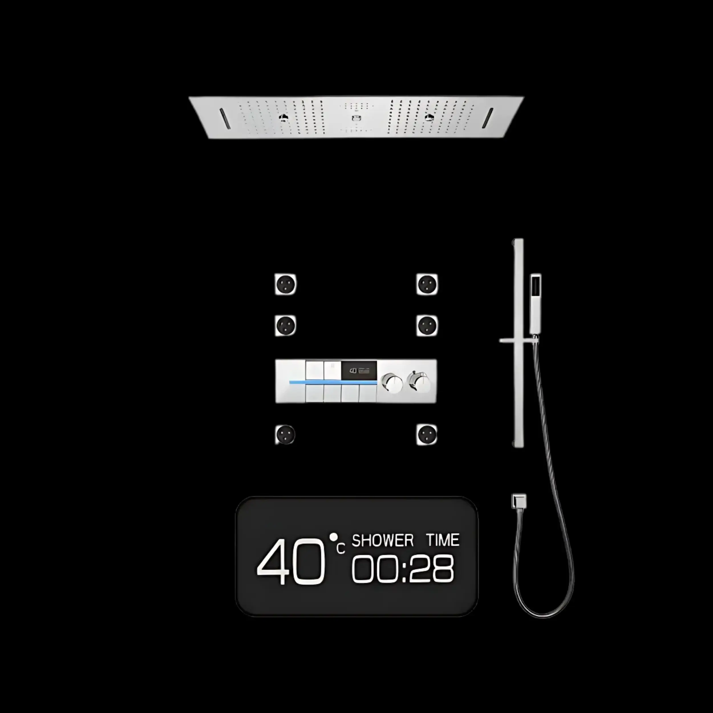 The BellaPioggia Shower System Vv-15383B-1 combines cutting-edge technology with sleek design, delivering an exceptional shower experience. Featuring a 6-function thermostatic main body, Bluetooth-enabled LED shower head, and six body jets, it brings ultimate relaxation and style to your luxury bathroom.