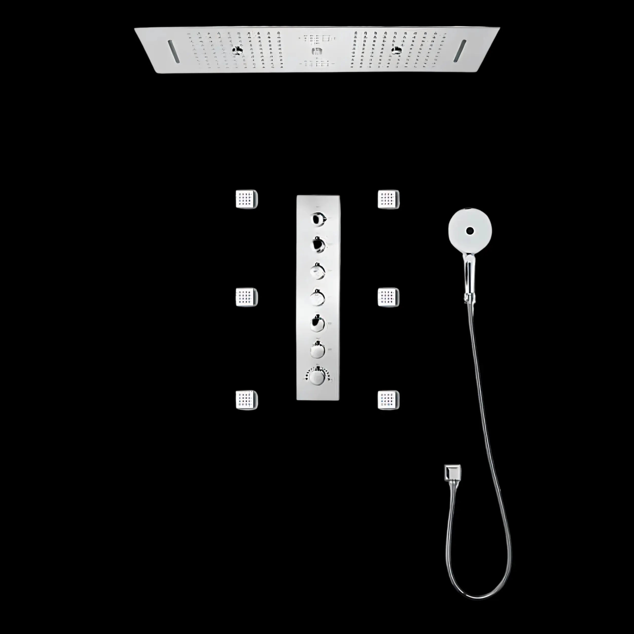 Discover the Eccezionale Multifunctional Thermostatic Shower in chrome, featuring a 6-function high-flow system, 4-function LED shower head with music, hand shower, and body jets. Elevate your shower with remote-controlled LED lighting and customized settings. Backed by a 5-year warranty, this system combines luxury and durability.