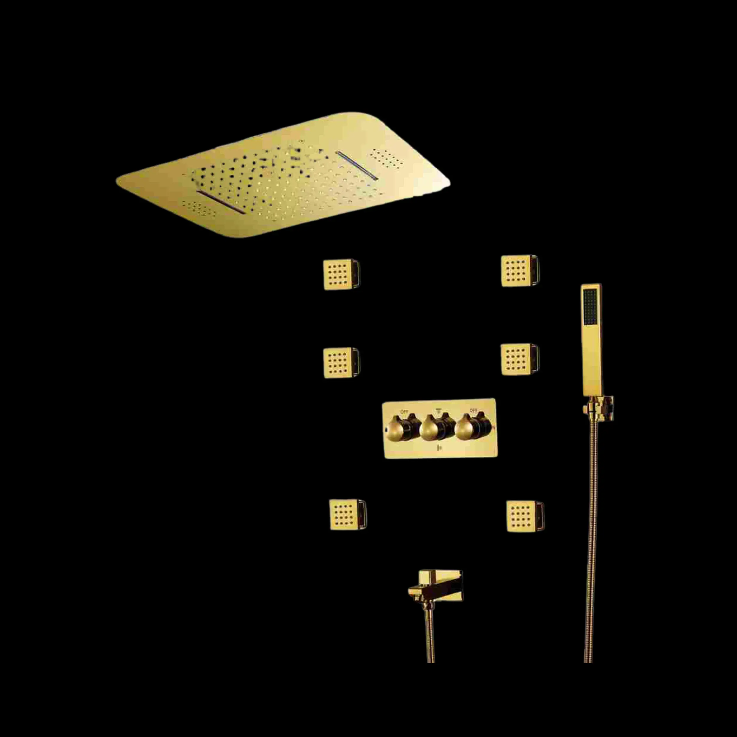 Elevate your showering experience with the EcoPioggia Gold Shower System VV-I05085D. Featuring 4-function hot & cold thermostatic control, an LED shower head with Bluetooth music, relaxing body jets, and a luxurious gold finish, it combines style, comfort, and performance for a spa-like experience at home.
