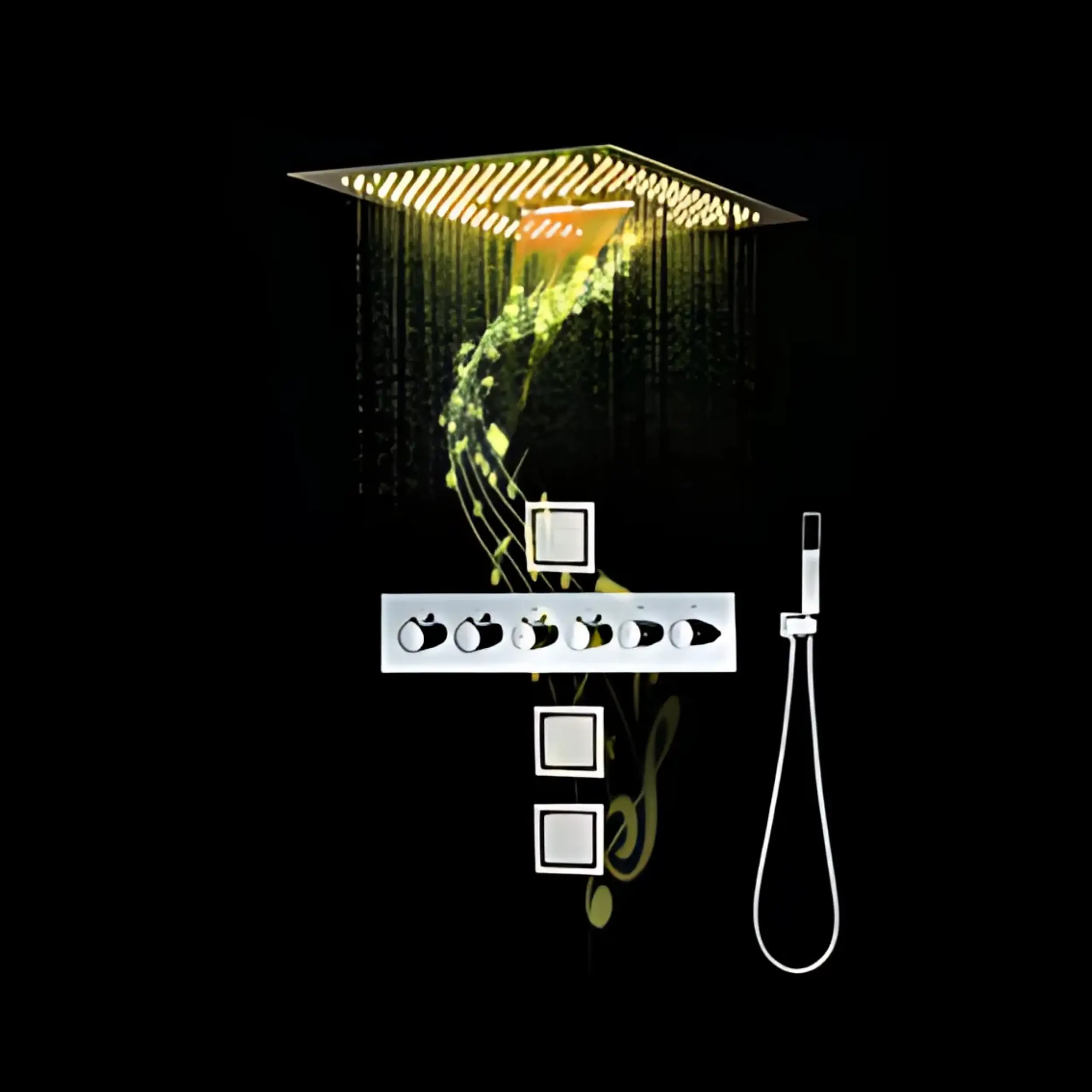 Transform your bathroom into a personal spa with the InfinityFlow Gold Shower System, Model Vv-16-5. Featuring three shower modes, a Bluetooth music system, and luxurious design, it offers an unparalleled shower experience with built-in music and massage jets.