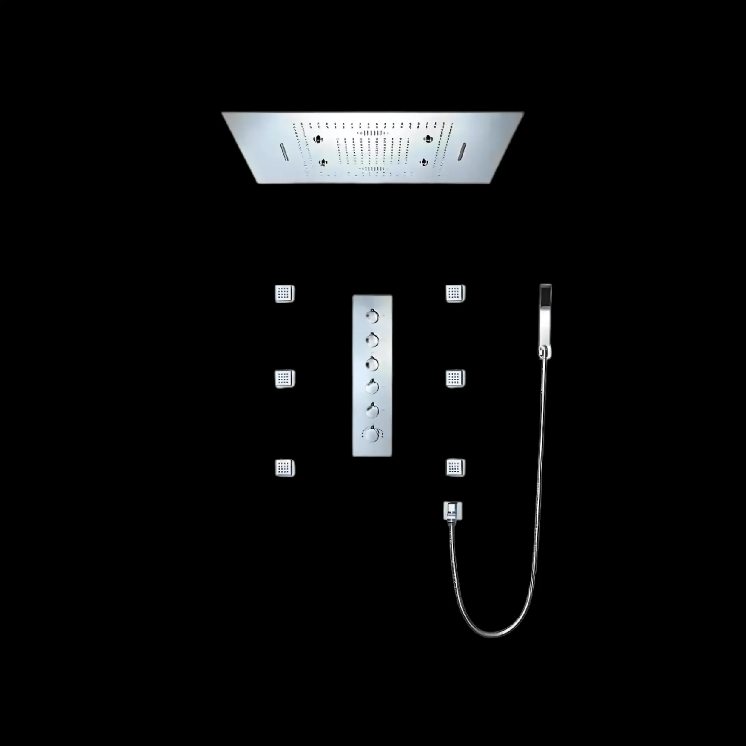 Discover the Serenità Shower System VV-05044B in chrome, featuring a 3-function LED shower head with Bluooth, 5-function thermostatic control, and high-flow body jets. Elevate your shower experience with this luxurious, feature-rich system.